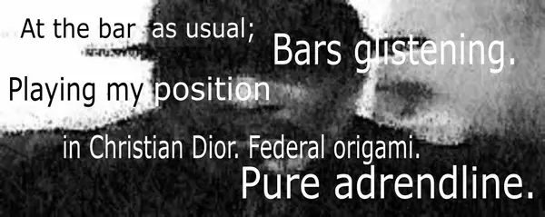 in the rotation- of escalating hateration . While my vocalized oscillating frequencies for excessive flossing causes a chain reaction of splasmic pelvic-estatic gyrating . Worn semi-automatic attachments still scrathes the himalayian thread-patterns of my delicately inter-woven favorite silk fabrics. The electro-matic static - contrastingly - adding dashes of brillance in clashes with handsomely flashes of one flower ninja magic's silvery-inked and autographed charismatic passages . Average to ravage- the perpetual lying line of studio savages. after the bubble-bath, sparkling spatter of her playfully boosting-my-head-up with... gold albums don't matter and aren't very flattering. The joy-bonding-ful-ness... of another cypha's chapter and my accountant lambasting of the calamities after... the after-math & damages is some-how fantastically gray-tones satisfying. i continue freestyling.... & de-fying... Passing The M,I,C I continue to floss too much. with a Midas touch in interactive, screen-sensitive, sexy pearl-white, victorian-inspired, frosted-vibranium, shimmery silk gloves. thinking of, the many seducing loves of my life. Chiba fogged cyphas. How many mics. Excalibur. Cleopatra. The un-timely, un-scheduled, unfortunate melt-down of my first nuclear reactor. I floss too much. Maybe talk about myself too much. How often do I mention- the plushness of my softness is marvelously accomodating to my loftiness. i can hear her when she loudly hushes. The rogue dimmering fire changes in her majestic blushes. her short cropped hair brushes my cheek as she continues softly cussing - and fussing about nothing. Girlishly giggling & gushing - the sound of the dusty rusty-geared buses- rushing by - is removed by her mesmerizing suggestive touches. Glances. Like exotic lances, re-mixed with the Way - she sway... with her off-beat dancing. i stuttered in my mental reciting and romancing - of my astrally projected intimate writings. Her desire - inviting - was trying to re-wire my primary safeguard protocols for handling my daily & nightly Knightly Responsibilities. chilling to think. i might flinch or blink.
